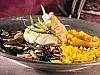 Nejliksaffransris: Koka 4 portioner ris med 1/2 påse (1/4 g) saffran och en lökklyfta med ett par kryddnejlikor istuckna. Salta.