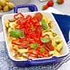 Koka upp grädde och crème fraiche. Rör i osten och låt den smälta i såsen. Salta och peppra. Häll såsen i formen och blanda om. Kärna ur och strimla paprikan och lägg ovanpå. Gratinera i 15 minuter. Garnera med salami och servera med sallad och oliver.