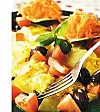 Strö över tomat, oliver och basilika.