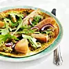 4. Grilla i ugnen i fem till tio minuter tills allt fått fin färg. Toppa med rucola och servera genast.