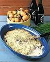 Lägg fisken på skärbräda med skinnsidan nedåt. Salta. Strö gräslöken över. Rulla ihop strömmingsfiléerna och lägg dem tätt i en smord eldfast form.