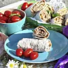 Bred kycklingröran på tunnbröden på 3/4 av ytan. Rulla ihop och dela rullarna. Servera med cocktailtomater.