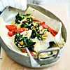 Lägg torsken i en smord ugnsfast form. Salta och peppra efter smak. Fördela spenat och lök över fisken. Skär tomaterna i klyftor och fördela dem över fisken. Smula över fetaost. Ringla över olivolja och krydda eventuellt lite till.