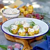 Lägg en klick laxröra på varje potatis och garnera med dill.