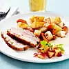 Skiva köttet. Servera med rostade rotfrukter, gräddsås och äpplen.