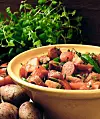 Lägg ner potatis, paprika och tomatklyftor i grytan. Tillsätt vatten, köttfond, paprikapulver, salt och kummin. Låt allt puttra på svag värme under lock ca 20 minuter.