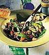 Fräs svampen i olja med kryddorna. Blanda tomatstrimlorna med svampen. Lägg upp svampen och ärterna på fat. Strö över gräslöken och häll över worcestershiresås blandad med vinäger. Vrid över svartpeppar.