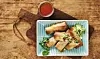 Det är gott att rulla in vårrullarna i salladsblad med salladslök och koriander, och doppa i sweet chilisås.