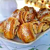 Rör ihop ingredienserna till fyllningen. Kavla ut degen till en platta, 20x50 cm och bred på fyllningen. Rulla ihop och skär i 2,5 cm breda bitar.