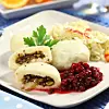 Fyllning: Skala och hacka löken fint. Ansa och hacka champinjonerna. Fräs lök och svamp i en stekpanna med matfett, tills löken är mjuk och vätskan från svampen kokat in. Smaksätt med worcestersås.