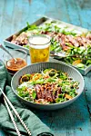Blanda grönsaker och örter. Lägg på biffen och strö över nötterna. Skeda över ett par matskedar av dressingen och servera resten vid sidan av.