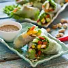 De krispiga vårrullarna fyllda av asiatiska smaker serveras med en enkel dippsås av soja, sweet chilisås och sesamfrön.
