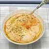 Fräs vitlöken i olivoljan, med skalet på, på svag värme tills den blir gyllenbrun, cirka 5 minuter. Skala. Mixa stekoljan, vitlök, bönor, harissa och yoghurt till en slät kräm. Smaka av med salt, peppar, citronsaft och eventuellt mer harissa.