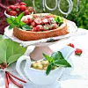 Till den söta, vita kladdkakan passar jordgubbar och en frisk rabarber-kompott utmärkt.