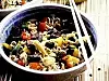 Skär köttet i tärningar eller strimlor. Skär squash, urkärnade paprikor och minimajs i små munsbitar. Strimla salladslökar eller snittade, sköljda purjolökar. Dags att woka eller också steka i stor stekpanna.