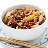 Tillaga nudlarna enligt anvisning på förpackningen. Hetta upp en stekpanna eller wok med olja och stek köttet hastigt i omgångar, lägg över i djup tallrik.