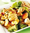 1. Strimla kycklingfilén. Fräs den i en het stek- eller wokpanna med lite olja i 2-3 minuter. Salta. Lägg upp på ett fat.