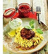 Matiga kikärtsbiffar och yoghurtsås med soltorkade tomater