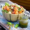 Melon, tomat- och fetaostsallad med basilikadressing